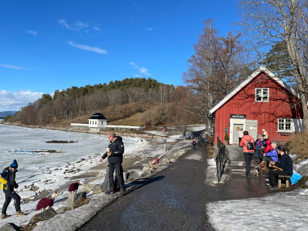 Vi tok buss 83 til Fiskevollen. Der kom vi inn på turveien og gikk først nordover. Så svingte vi mot vest og gikk sørover langs Bunnefjorden. Der var det fin utsikt mot Nesodden og det var satt ut flere benker. Snart kom vi til Hvervenbukta. Ved stranda dominerte strandpaviljongen fra 1770-årene som tilhørte herregården Stubljan. Sjøen var islagt. Men isbadere dukket under likevel i et hull for formålet. Vi gikk videre noen hundre meter til Ringskjærodden der vi snudde mot Hvervenbukta igjen. Da var det klart for kaffepause på kaféen Anne på landet. Deretter gikk turveien ved siden av bilveien tilbake til Fiskevollen.